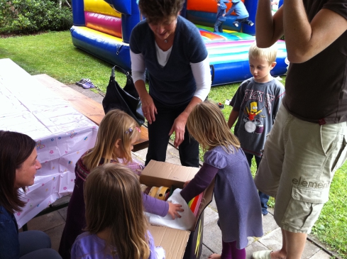Amelie und Julia öffnen gespannt ihre klexxbox. Die Gäste warten schon.